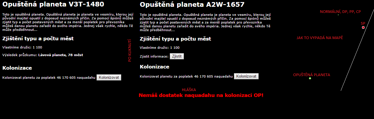 - Po kliknutí na planetu se zobrazí možnosti získání informací o planetě (typ a města) a taktéž kolonizace planety.